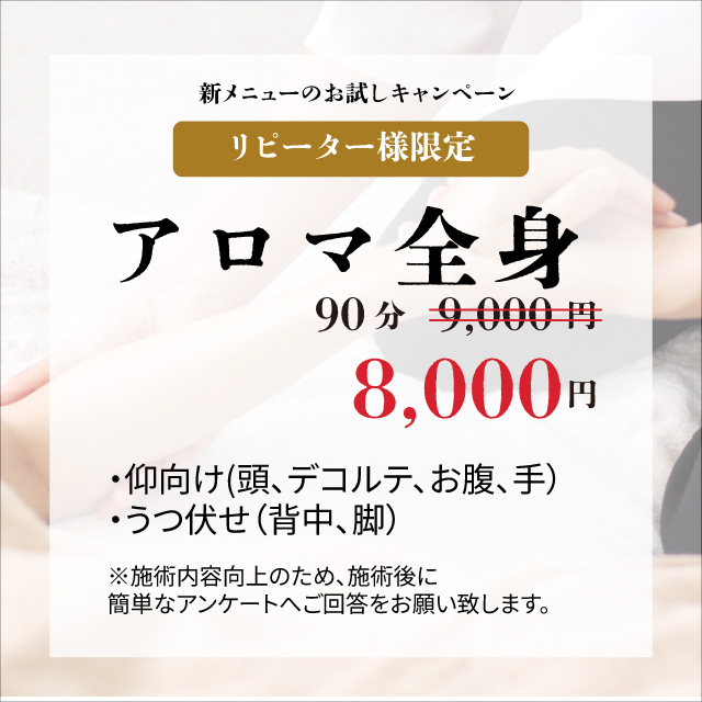 【内容】アロマのみ全身 90分9,000円→8,000円に